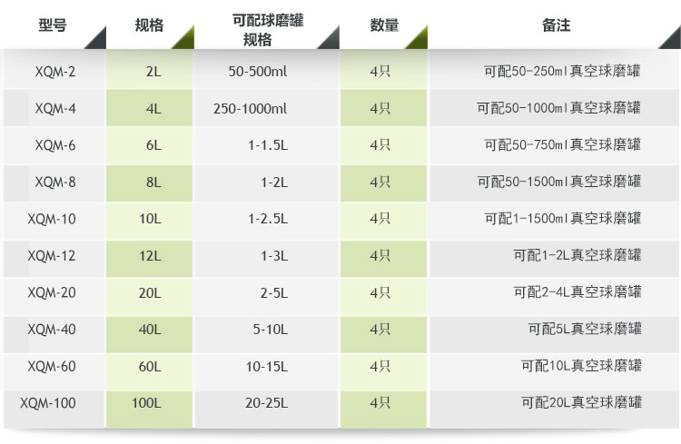 表一:微電腦行星球磨機配罐參數